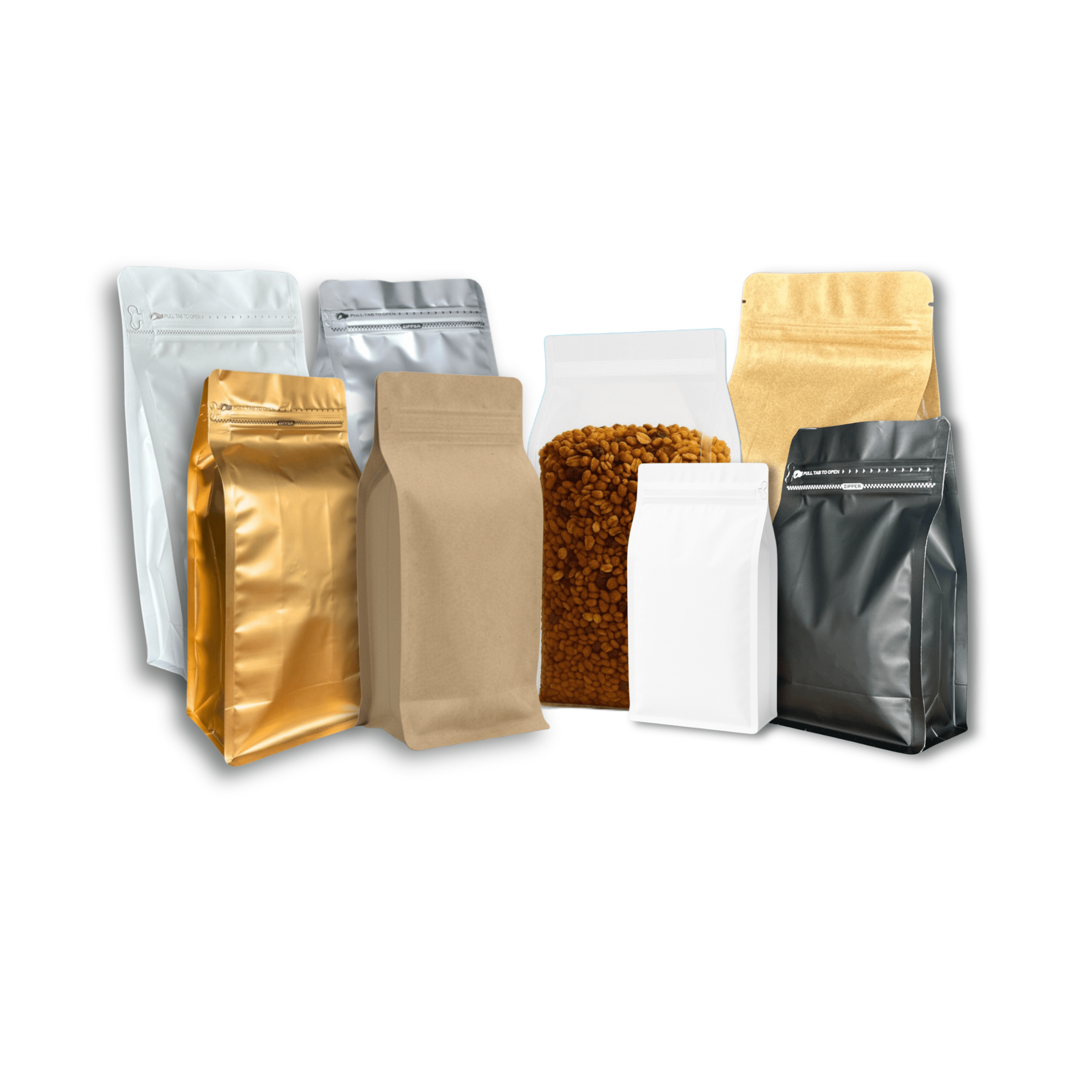 Esse formato é muito parecido com as embalagens tradicionais de cafés gourmet. Ele tem as quatro laterais seladas e bem marcadas, formando um “tijolinho” reto.